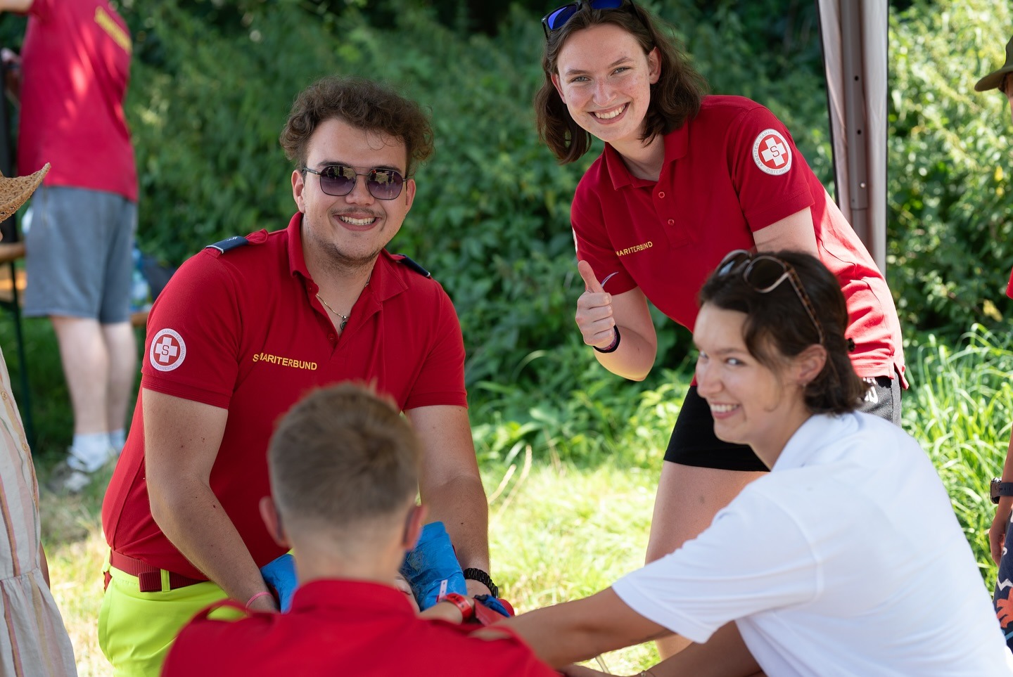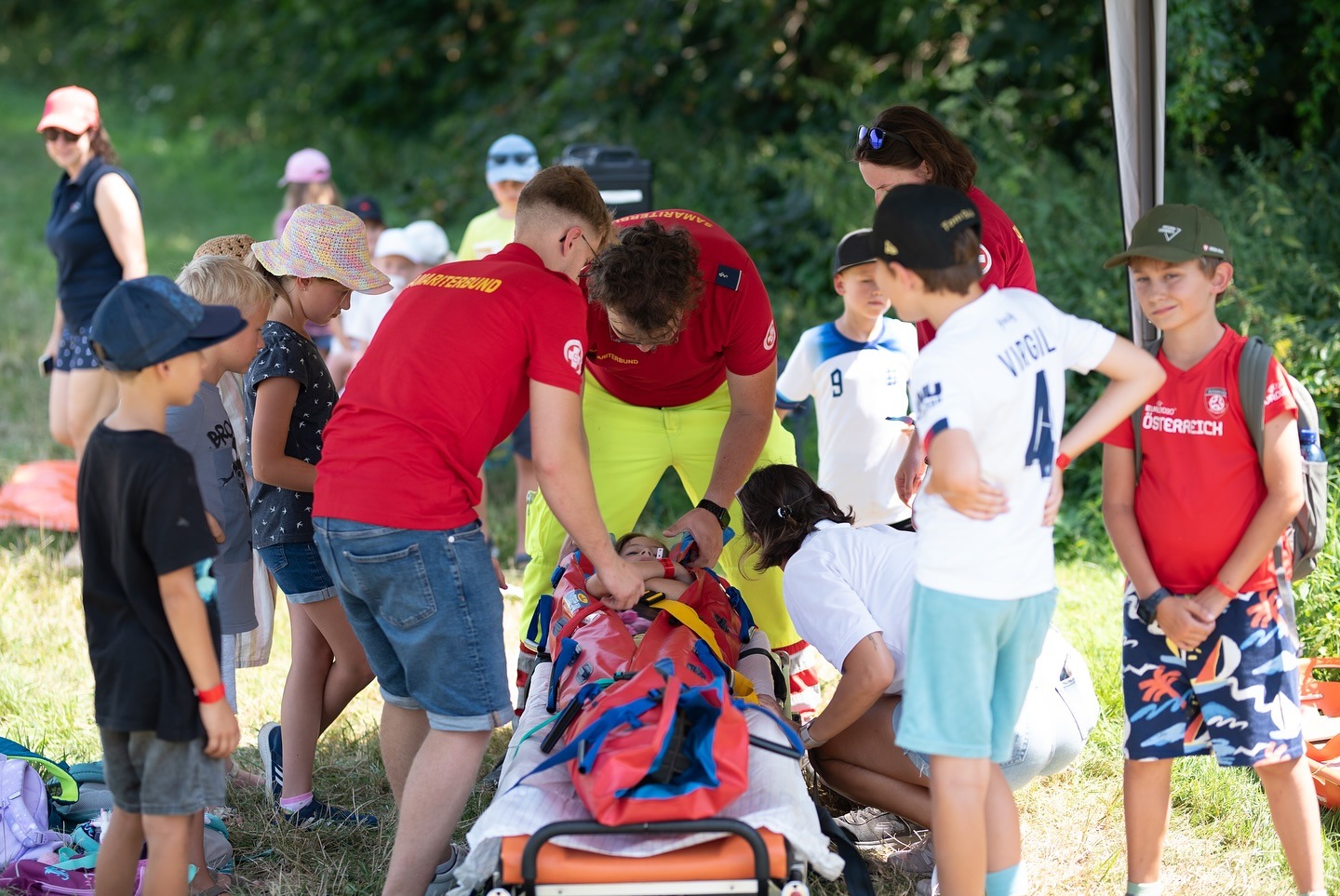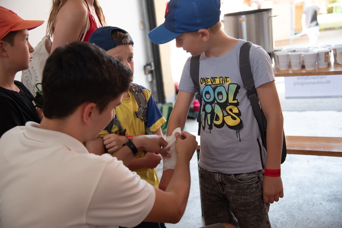 Auf der Dienststelle konnten die Kinder die Grundlagen der Ersten Hilfe lernen, spannende Fallbeispiele üben, in der Hüpfburg hüpfen und im Schulungsraum wurden ihnen Wunden geschminkt.